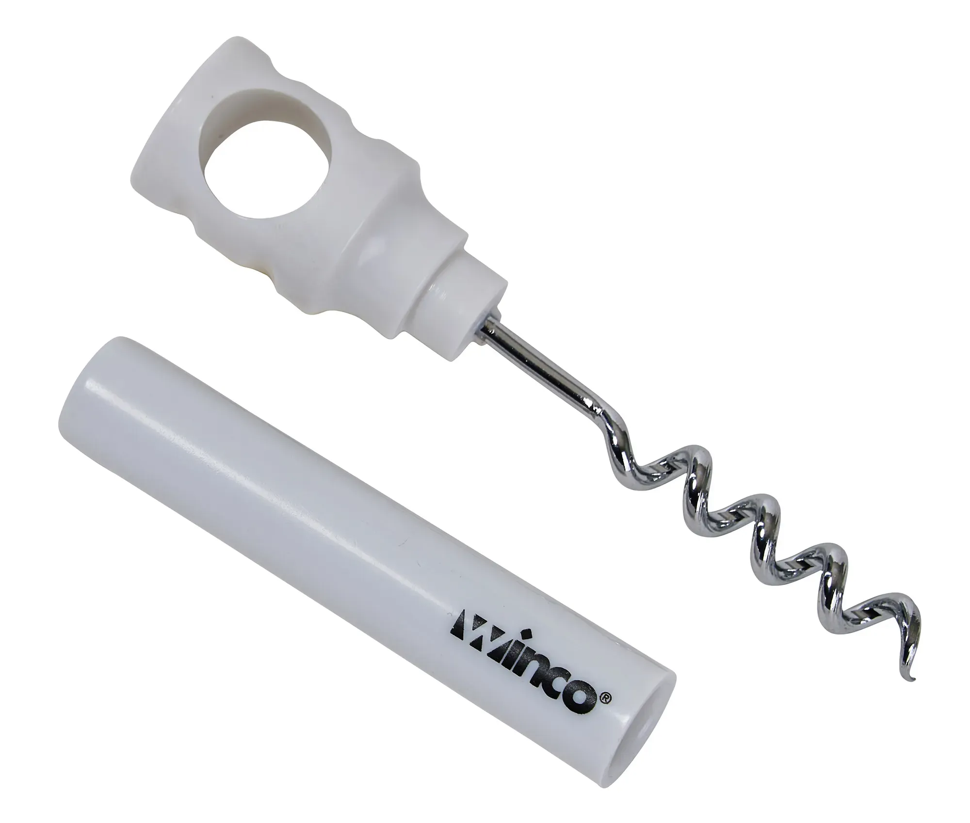 Ideal for professional settings, the Winco Cork Screw 2 Piece Pack is an essential tool for any restaurant looking to provide efficient and seamless service. This product, featuring a sturdy plastic handle in a clean white color, ensures both durability and ease of use, making it a reliable choice for busy environments.