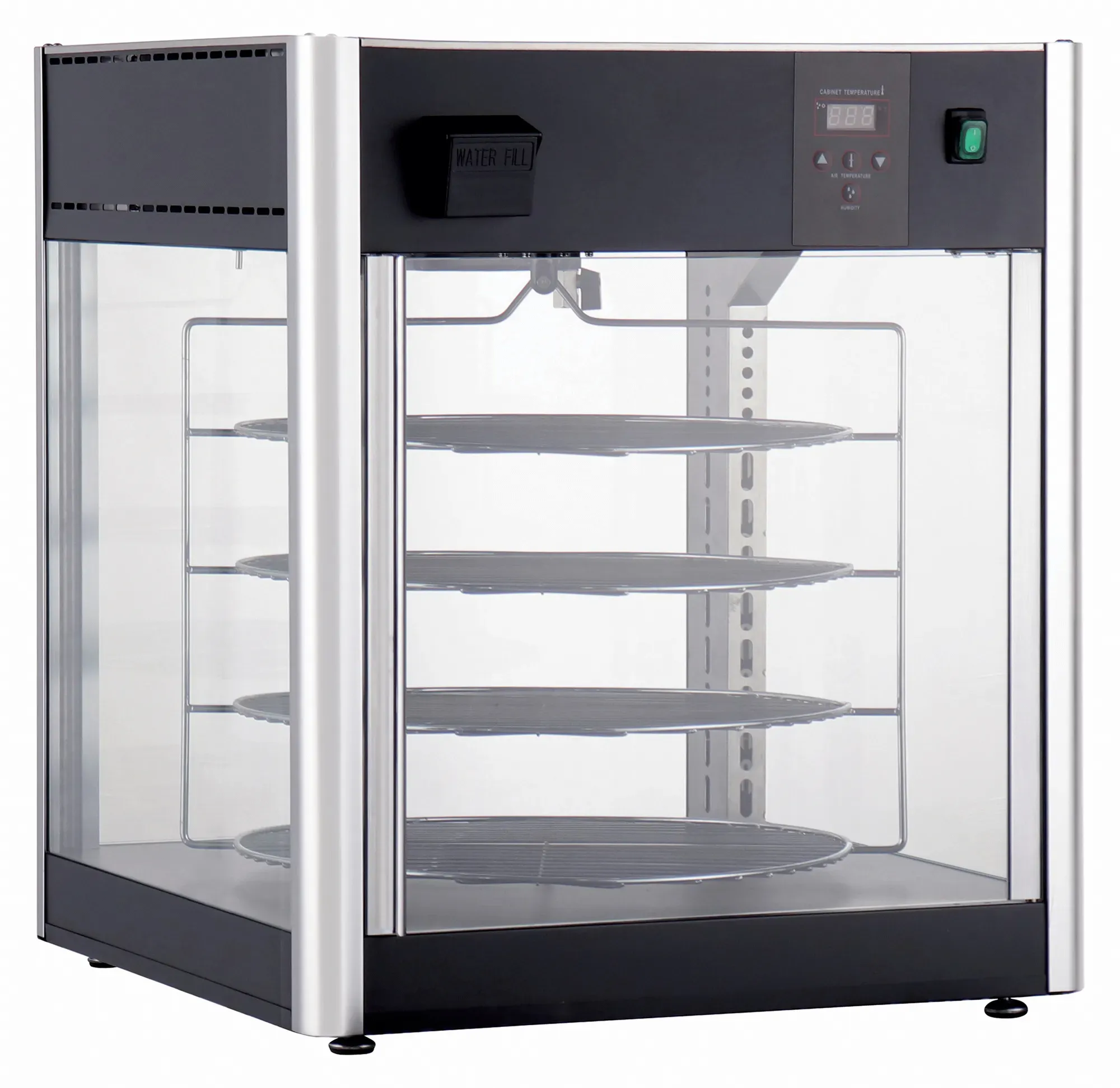 Streamline food preparation with the Winco Electric Display Merchandiser. This sleek, matte black unit is designed to enhance the efficiency and presentation of your restaurant's offerings. With 18 racks, the Winco Electric Display Merchandiser provides ample space to showcase a variety of dishes, keeping them warm and ready for service.