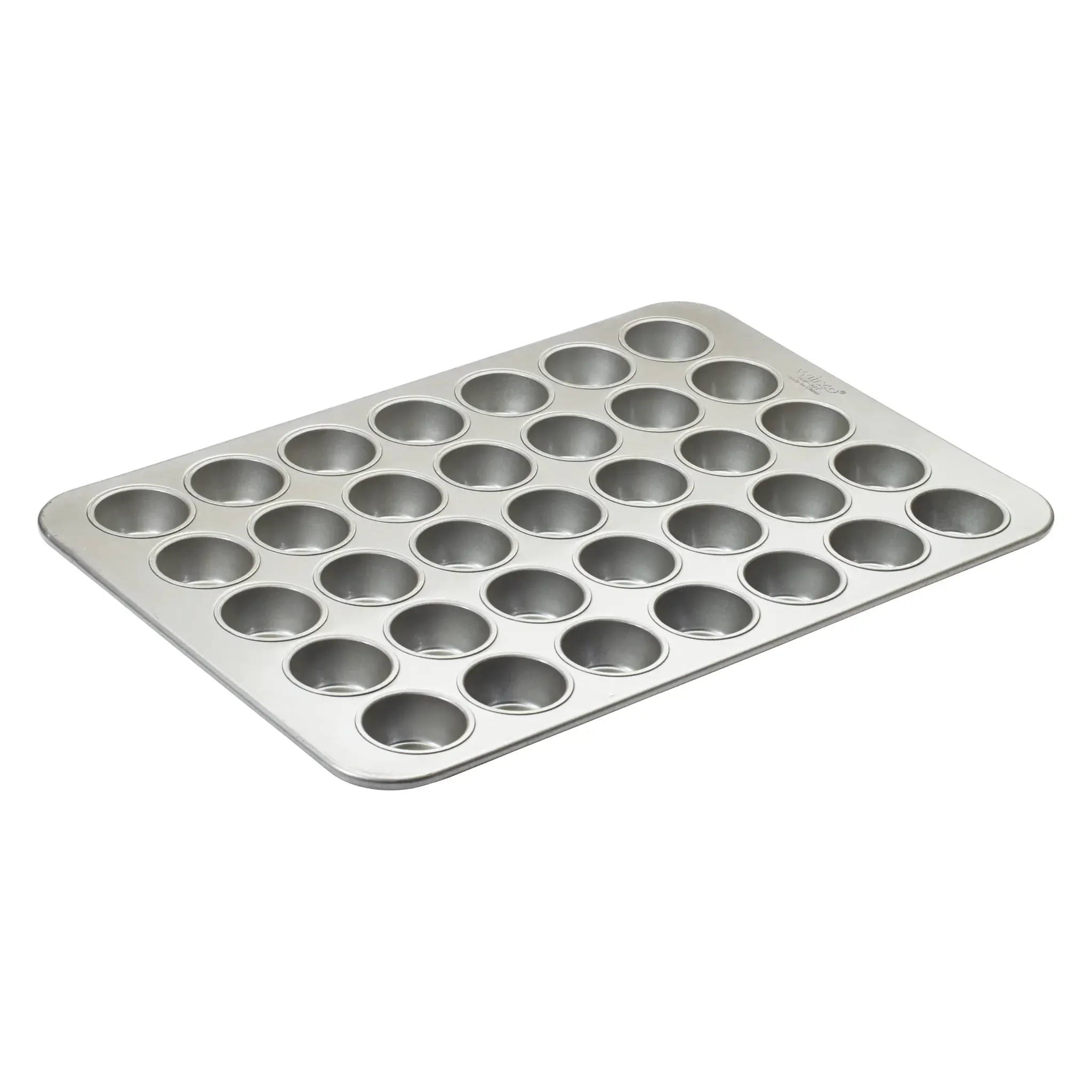 These non-stick muffin pans are designed for use in commercial ovens and on speed racks. The cups are properly spaced for achieving ideal muffin tops. Heavy-duty 26-gauge aluminized steel Premium non-stick coating for clean release Closed bead, wire-in reinforced rim All pans are 17-7/8" x 25-7/8", ideal for sheet pan racks