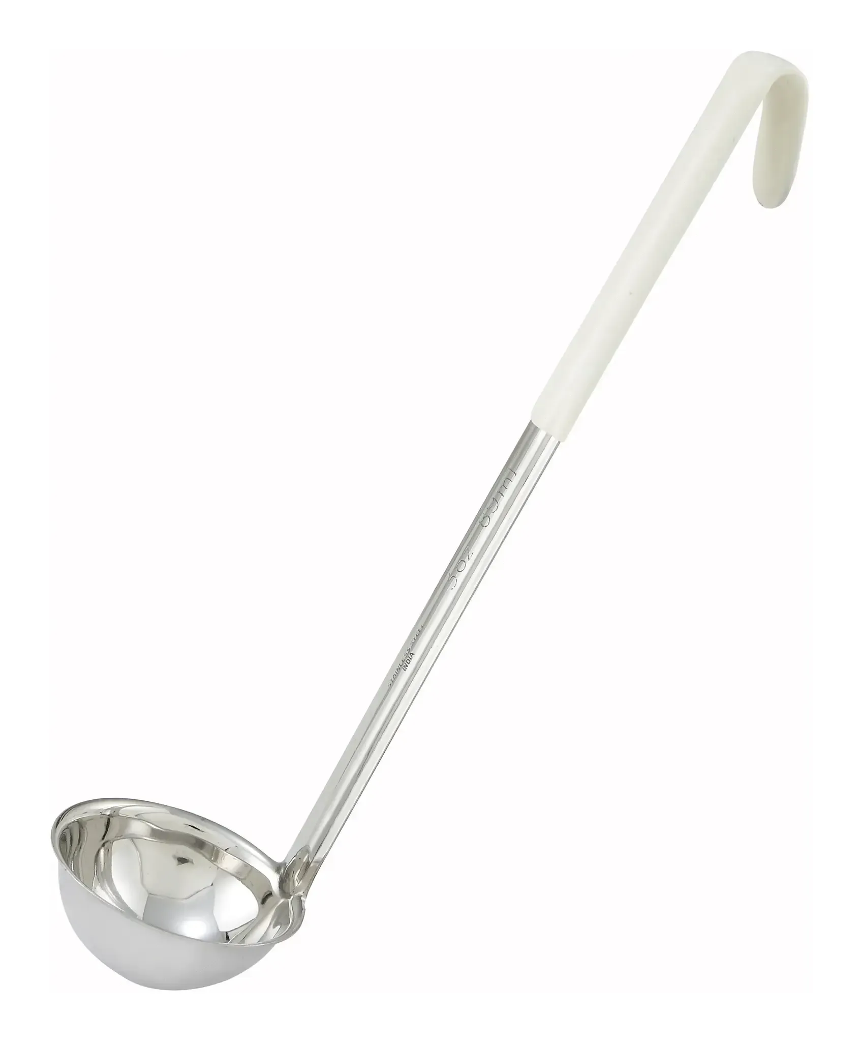 Achieve professional-level results with the Winco Color-Coded Ladle. Designed specifically for the demanding environment of a restaurant kitchen, this 3 oz. ladle is an essential tool for precise portion control and efficient service. The 13-inch handle provides ample reach, ensuring you can easily serve soups, sauces, and dressings from deep pots and containers without compromising on comfort or control.