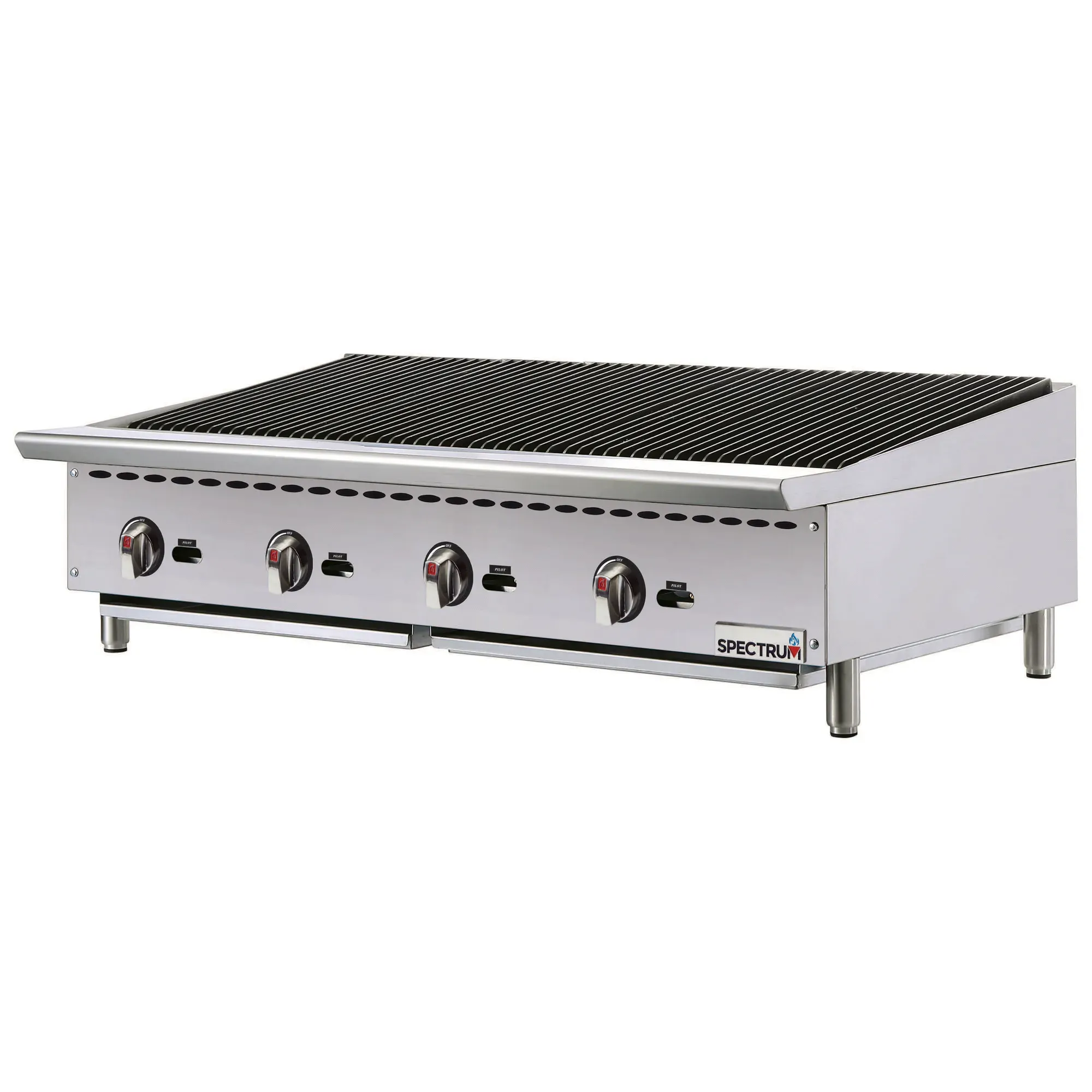 Enhance dining experiences with the Winco Spectrum Charbroiler, a top-tier natural gas countertop unit designed to meet the high demands of any bustling restaurant kitchen. With a spacious 48-inch width and 34-7/16-inch depth, this charbroiler offers ample cooking surface to handle multiple orders simultaneously, ensuring efficiency and speed during peak hours. Equipped with powerful 35,000 BTU burners, the Winco Spectrum Charbroiler delivers consistent and robust heat, perfect for achieving that signature charbroiled flavor. The 10-gauge stainless steel radiant burner cover ensures even heat distribution, while the infinite heat controls allow for precise temperature adjustments, catering to a variety of cooking needs. The charbroiler features reversible and adjustable cast iron grates, providing versatility and durability for long-term use. The 3-1/2 full-width grease trough and removable grease trays make cleanup a breeze, maintaining a hygienic cooking environment. The stainless steel insulated double wall body and cool-touch front plate rail enhance safety and durability, making it a reliable addition to any kitchen. Designed with practicality in mind, the Winco Spectrum Charbroiler includes a 3/4 rear gas connection with a regulator and an LP conversion kit, offering flexibility in installation. The adjustable legs and non-skid feet ensure stability on any countertop surface. Certified by CSA for Flame and Star standards, this charbroiler guarantees top-notch performance and safety. Elevate your restaurant' s culinary offerings with the Winco Spectrum Charbroiler, model NGCB-48R, and experience the perfect blend of power, precision, and reliability.