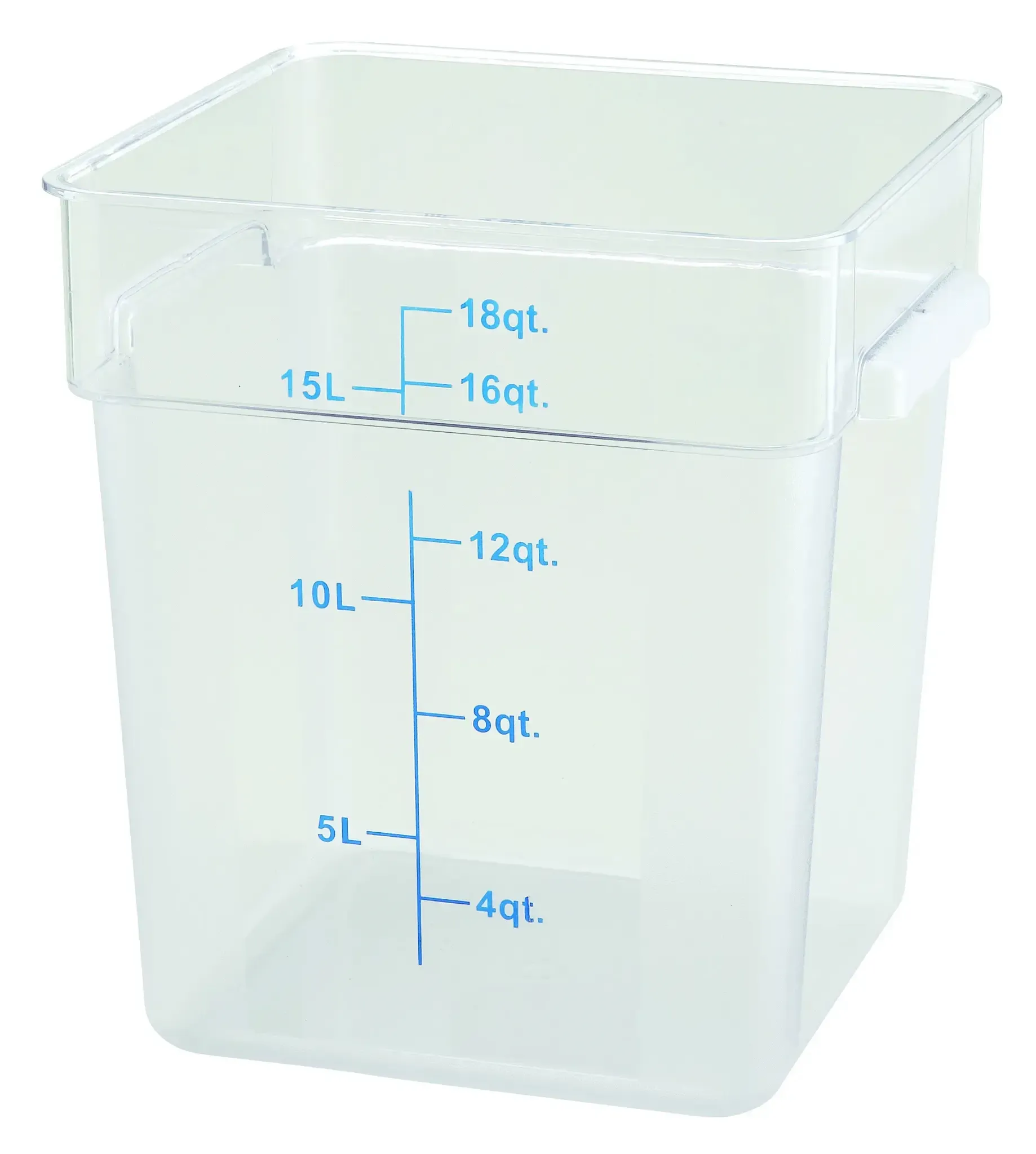 Achieve professional-level results with the Winco 18qt Square Storage Container Clear PC. Designed to meet the rigorous demands of a bustling restaurant kitchen, this high-capacity storage solution is perfect for keeping your ingredients fresh and organized. The 18-quart capacity ensures ample space for storing bulk items, from fresh produce to dry goods, making it an essential addition to any commercial kitchen. Crafted from clear polycarbonate, the Winco 18qt Square Storage Container offers exceptional durability and visibility. The clear material allows for easy identification of contents at a glance, reducing the time spent searching for ingredients and enhancing kitchen efficiency. Its square shape maximizes storage space, allowing for easy stacking and optimal use of your storage area. The robust construction of the Winco 18qt Square Storage Container ensures it can withstand the daily wear and tear of a busy restaurant environment. Its sturdy design is resistant to cracks and breaks, providing long-lasting performance and reliability. Additionally, the container is easy to clean, ensuring that maintaining hygiene standards is a breeze. Whether you are storing prepped vegetables, marinating meats, or organizing pantry staples, the Winco 18qt Square Storage Container Clear PC is the ideal solution for your restaurant's storage needs. Its practical design and durable construction make it a valuable asset in any professional kitchen, helping you achieve seamless operations and maintain the highest standards of food safety and quality.