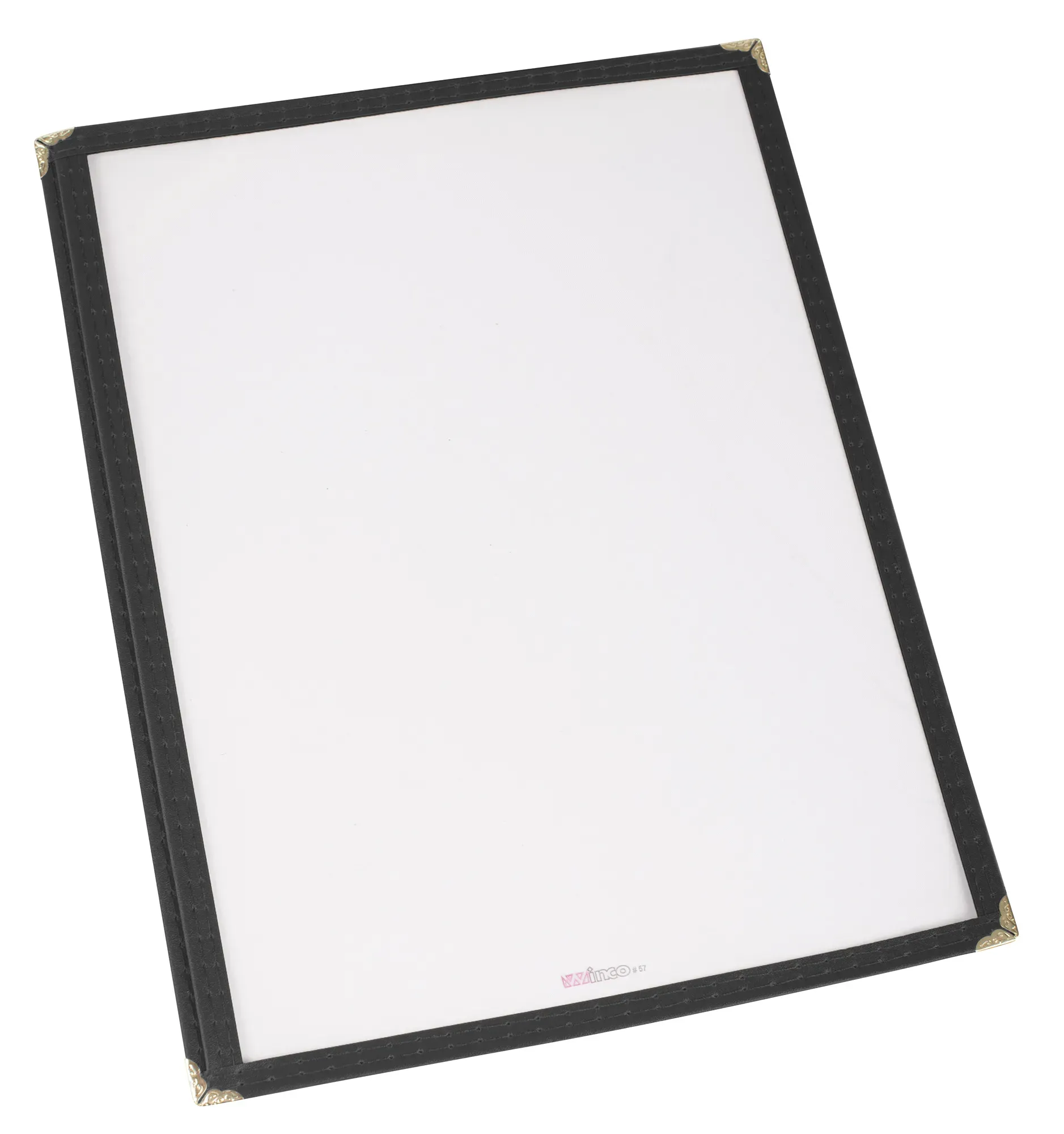 Enhance the cooking repertoire with the Winco Menu Cover, a sophisticated and durable solution designed to elevate your restaurant's presentation. This single overall menu cover measures 9-3/8 x 12-1/8 inches, perfectly accommodating 8-1/2 x 11-1/2 inch paper. Its sleek black plastic construction not only provides a professional look but also ensures longevity and ease of maintenance.