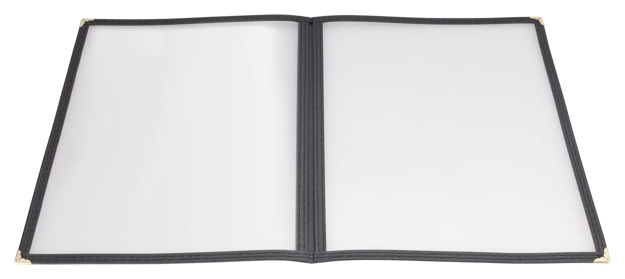 Crafted with a sleek black finish, the Winco Menu Cover features double-stitched edging, ensuring durability and a polished look that complements any restaurant decor. The plastic construction not only offers a professional appearance but also makes it easy to clean and maintain, perfect for the high-traffic environment of a busy restaurant.