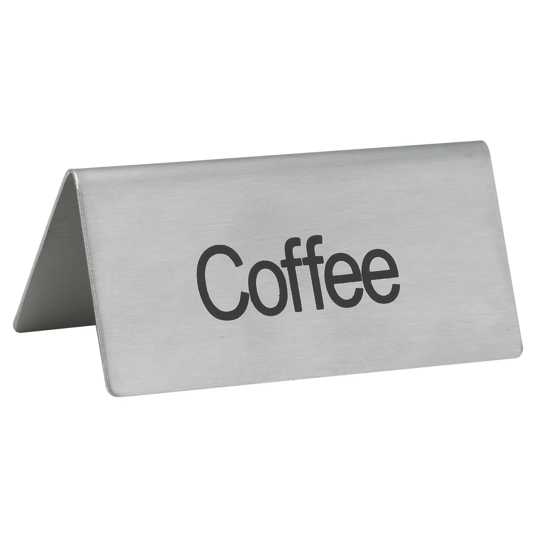 Enhance kitchen efficiency with the Winco Beverage Tent Sign Coffee. This sleek and durable sign is designed to clearly label your coffee station, ensuring that your guests can easily identify their beverage options. Measuring 3 inches in length, 1-1/2 inches in width, and 1-1/4 inches in height, this compact sign is perfect for any restaurant setting, from bustling breakfast buffets to elegant brunch services.