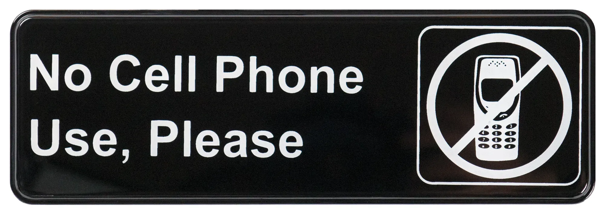 Simplify cooking processes with the Winco No Cell Phone Use Sign. Designed specifically for restaurant environments, this essential sign measures 9 inches by 3 inches, making it the perfect size to catch the attention of both staff and patrons without being obtrusive. The clear white imprint on a black background ensures high visibility and readability, effectively communicating the message: "No Cell Phone Use Please."