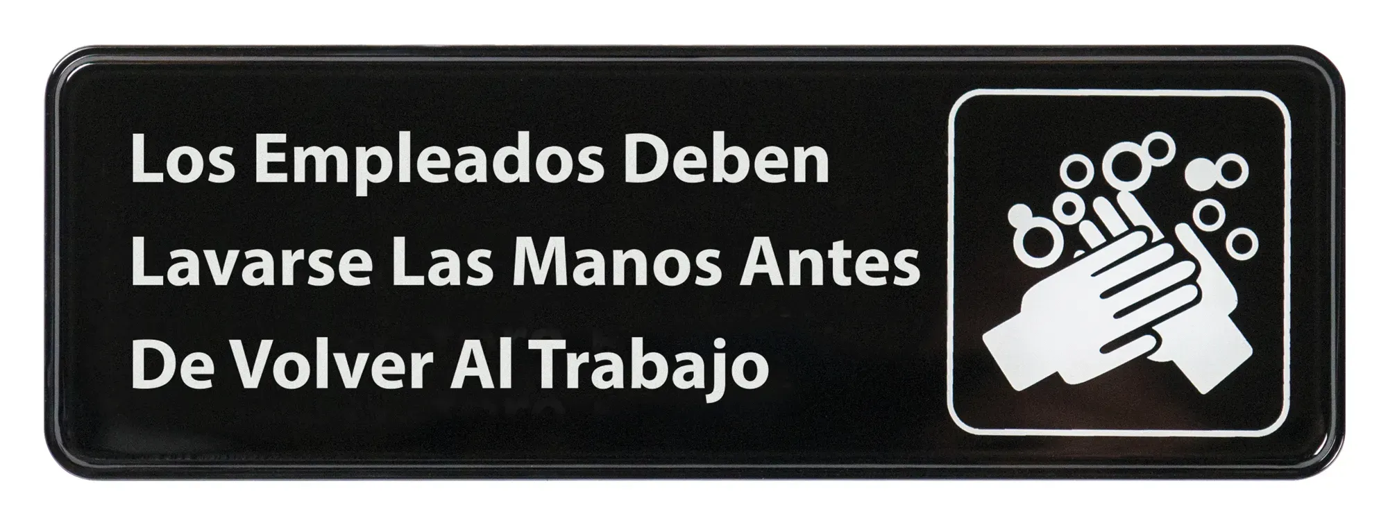 Optimize kitchen workflow with the Winco Information Sign. This essential sign, measuring 9 x 3 inches, is designed to ensure that all employees adhere to crucial hygiene standards. Featuring a clear and direct message in Spanish, "Employees Must Wash Hands Before Returning To Work," this sign is perfect for maintaining a clean and safe kitchen environment.