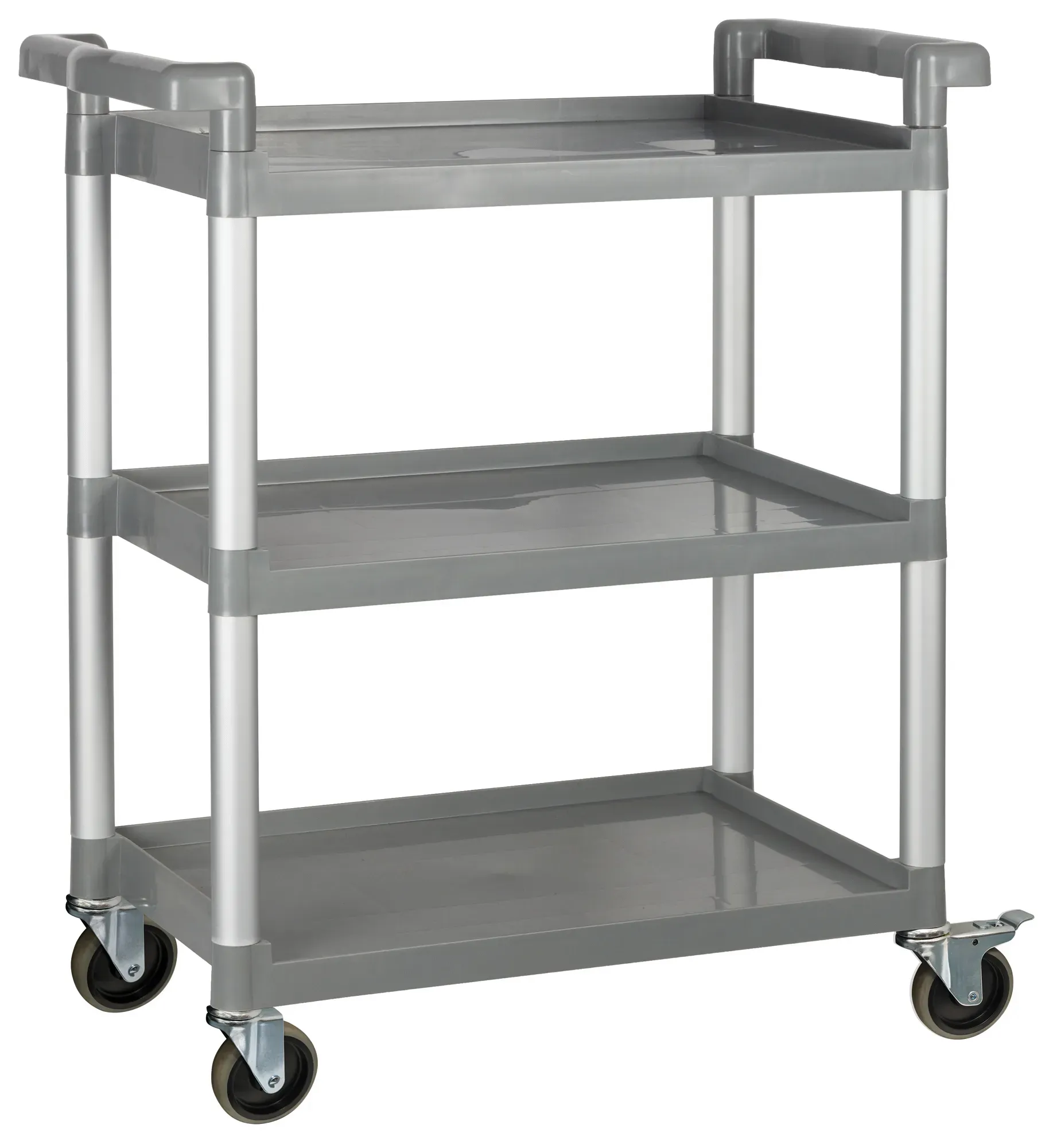 The Winco Plastic Utility Cart boasts a robust construction with dimensions of 32 inches in length, 16-18 inches in width, and 36-34 inches in height. Its three-tier design provides ample space for transporting a variety of items, from ingredients and utensils to prepared dishes and cleaning supplies. The gray color adds a sleek, professional touch that seamlessly blends with any restaurant decor.
