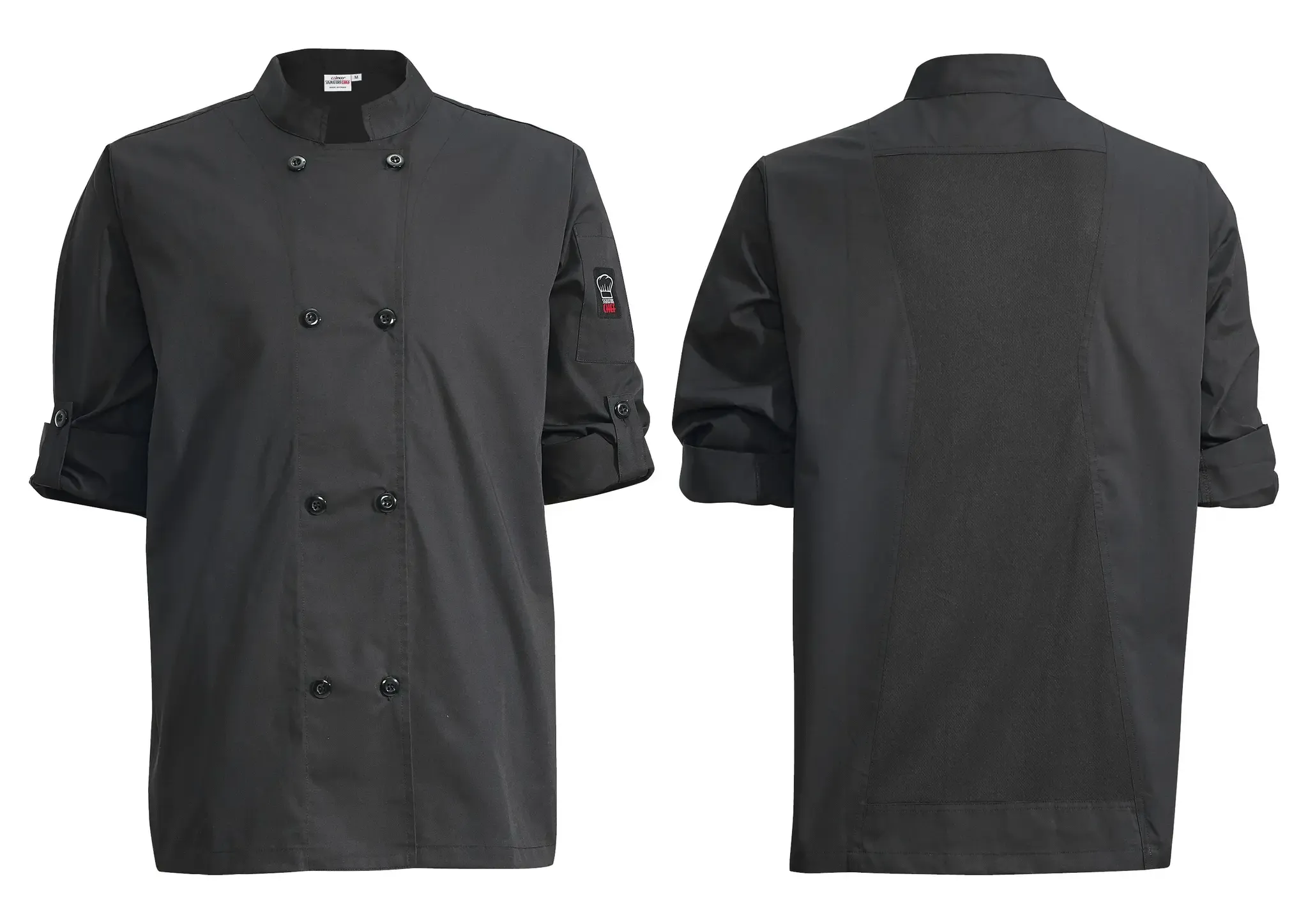 Double-Breasted – Two rows of buttons create a traditional, double-breasted chef’s jacket ideal for upscale hotels, restaurants and resorts Mesh Ventilation Panels – Cool ultra-breathable mesh panels on the back, sides and underarms Roll-Up Sleeves – One-button tab quickly secures the roll up sleeves Breathable – Lightweight poly-cotton blend ensures breathability in hot kitchens Machine Washable