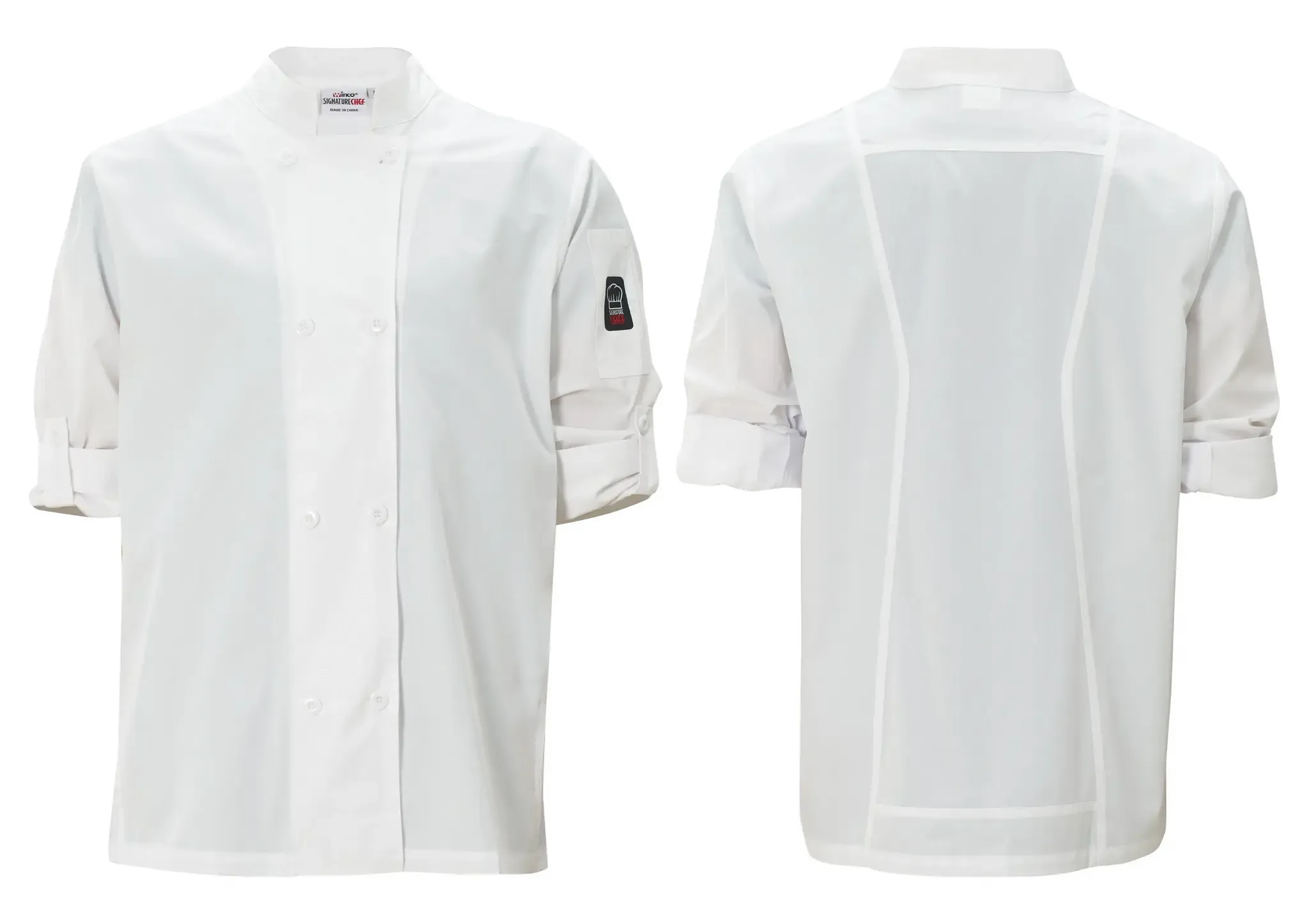 Double-Breasted – Two rows of buttons create a traditional, double-breasted chef’s jacket ideal for upscale hotels, restaurants and resorts Mesh Ventilation Panels – Cool ultra-breathable mesh panels on the back, sides and underarms Roll-Up Sleeves – One-button tab quickly secures the roll up sleeves Breathable – Lightweight poly-cotton blend ensures breathability in hot kitchens Machine Washable